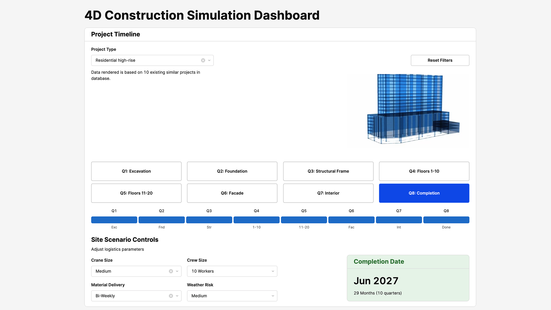 Planning a construction project means making hundreds of decisions before a single brick is laid — and each one has a ripple effect on timeline and cost. I combined a 3D parametric model (Rhino + Grasshopper) with a Retool dashboard to make those ripple effects visible. Change the crew size, adjust material delivery frequency, factor in weather risk — and watch the completion date update in real time. This is exactly where my architecture and data backgrounds collide: I understood the construction logic well enough to model it, and the UX principles well enough to make it usable by someone who just needs the answer.